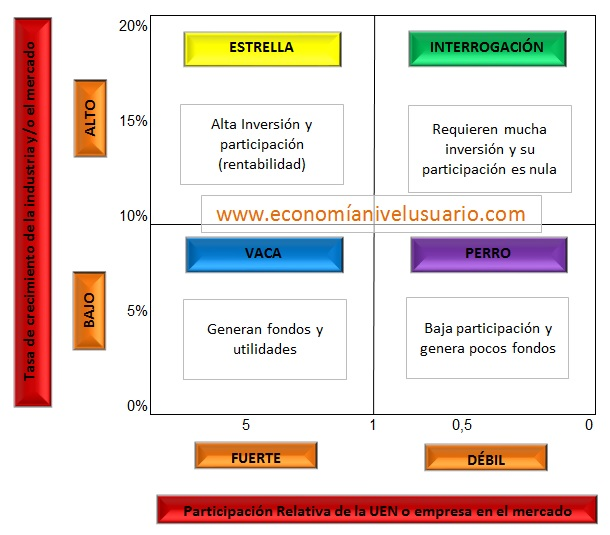 1. Cuatro cuadrantes 2×2, cada uno de los cuales propone una estrategia diferente para las unidades de negocio. El eje vertical de la matriz define el crecimiento en el mercado, y el horizontal la cuota de mercado. Las distintas unidades de negocio se sitúan en uno de los cuatro cuadrantes en función de su valor estratégico.