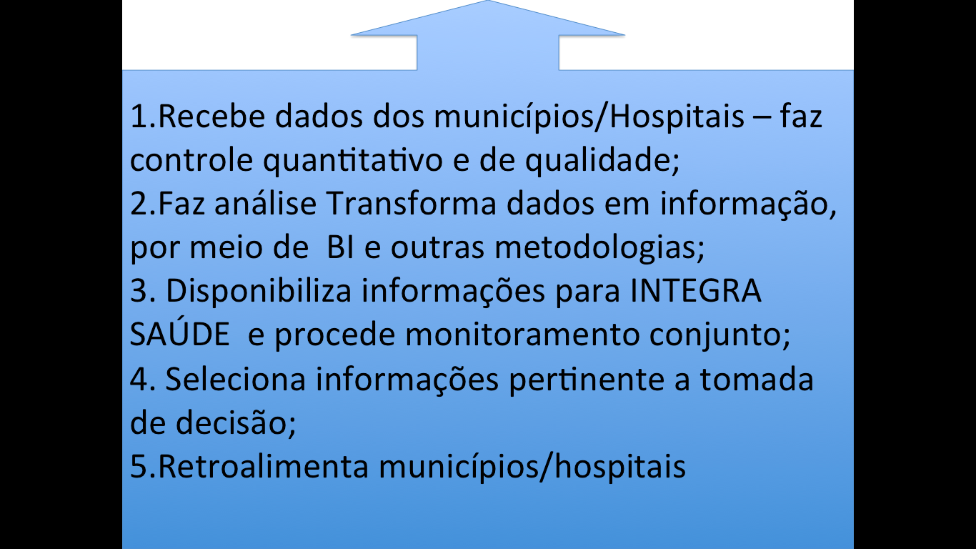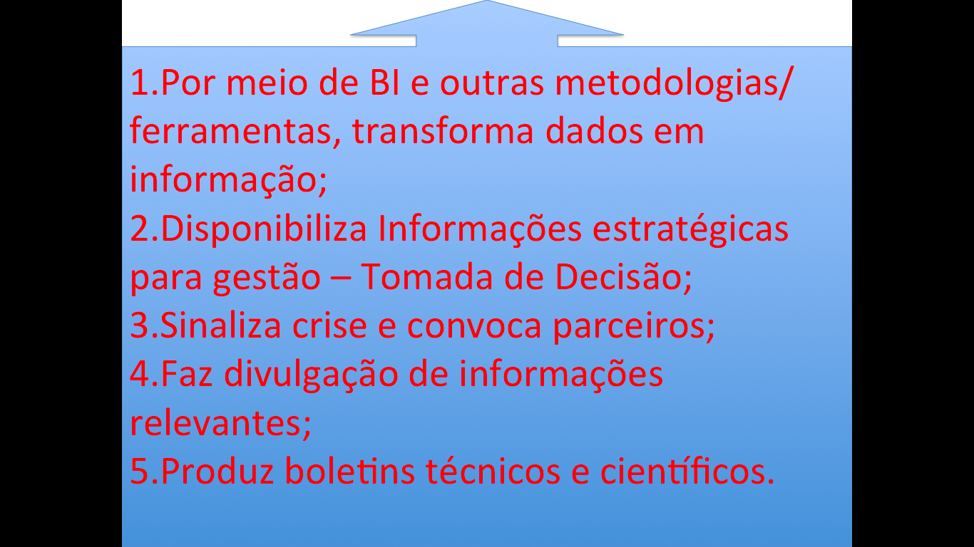 Disponibiliza INFORMAÇOES ESTRATÉGICAS para gestão – Tomada de Decisão, relacionadas a: 1.Gestão 2.Orçamento 3.Internação hospitalar/Tx ocupação/produção 4.Regulação 5.Acompanhamento de Obras 6.Mortalidade 7.Morbidade 8.Agravos: Arboviroses, Malária, DSTs 9.Violências 10.Imunização 11.Ambiental 12.Risco Sanitário 13.SAMU 14.Processos/Compras/Contrato15.RH 16.Produção Ambulatorial 17.Recursos descentralizados para municípios 18.Determinantes Sociais (Segurança, Defesa Civil, Bombeiros) 19.Projeto OPAS