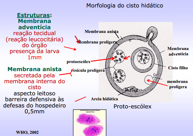 Membrana anista secretada pela membrana interna do cisto aspecto leitoso barreira defensiva às defesas do hospedeiro 0,5mm