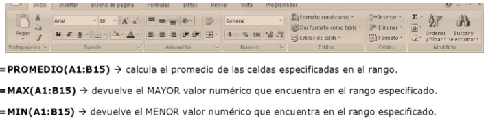 =SUMA(A1:B15) >suma TODOS los valores que se encuentran en las celdas especificadas en el
