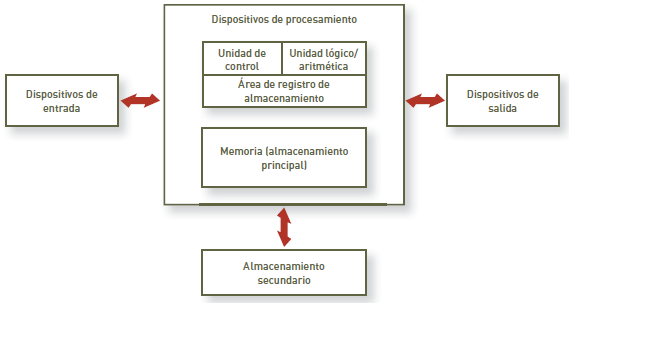 1. Incluyen los dispositivos de entrada, de salida, de almacenamiento secundario y la unidad central de procesamiento (CPU). La unidad de control, la unidad lógico/aritmética (ALU) y las áreas de registro de almacenamiento conforman la CPU