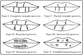 Tipo I: Patrones de surcos en linea recta dispuestos verticalmente y recorriendo la anchura de los labios