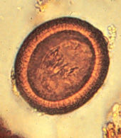 formato redondo com casca protetora, sendo encontrado nas fezes humanas.