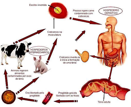 A teníase se dsenvolve pela ingestão de carnes cruas de