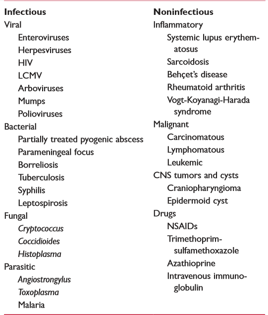 nenhuma causa aparente após colorações e culturas rotineiras do LCR. Os vírus são a causa mais comum. Outras causas podem ser não infecciosas.