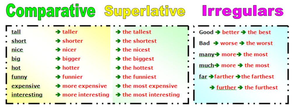 Examples: my car is faster than yours , Mary is more beautiful (than Susan) Russia is much bigger (than Greece)