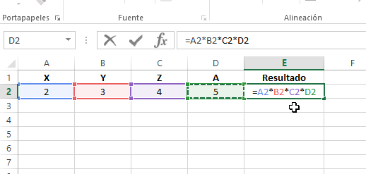 un 10, la celda B1 con un 4, y el resultado que nosotros queremos es A1xB1 = C1 (40).