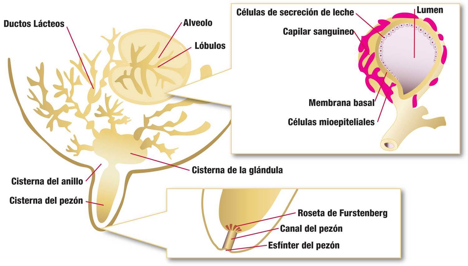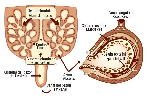 Cada glándula consta de: tejido secretor , un sistema de ductos, dos cisternas y una teta