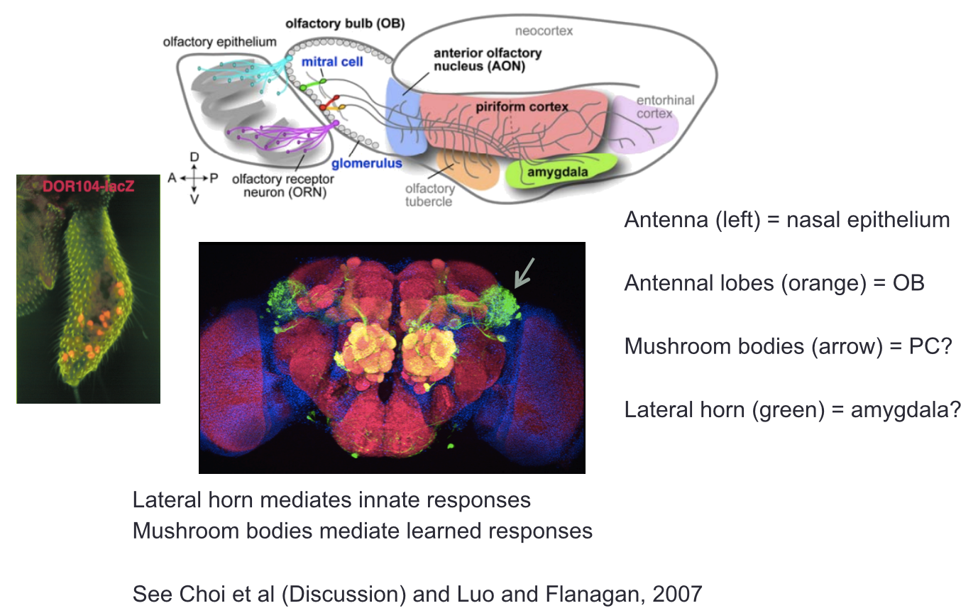 e.g. trimethyl-thiazoline (TMT) from fox elicits fear (in mice!)