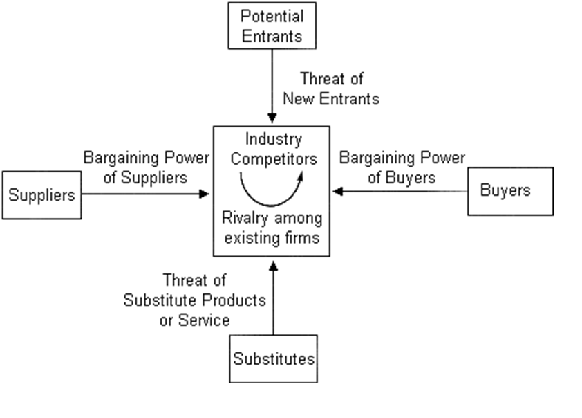 Barriers to entry, subsitutes, buyers power, suppliers power and rivalry.