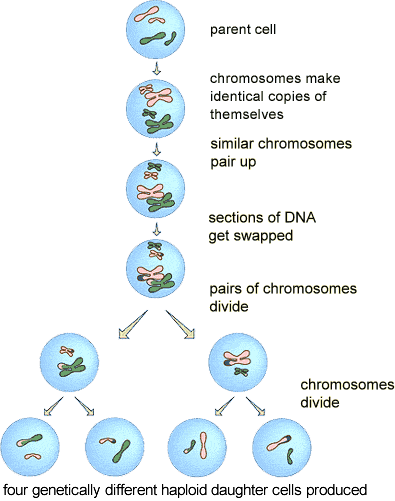 Two stage cell division in which the chormosome number of the parental cell is reduced by half, process by which gametes are formed