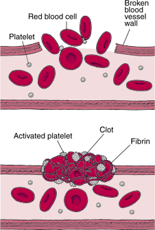 in clots, platelets are held together by a mesh of protein called fibrin, these tangle up red blood cells to help from a clot