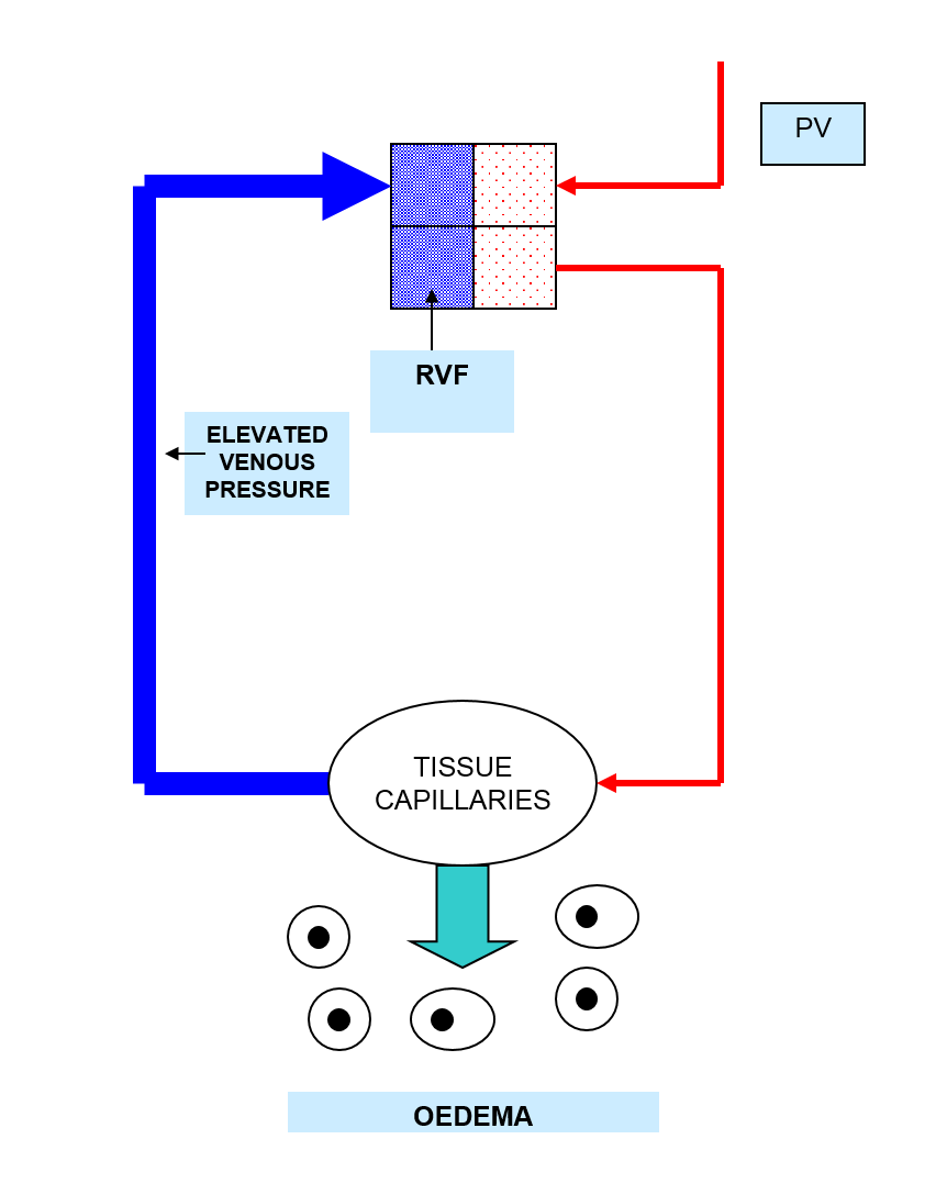Blood accumilation in RV and RA - inc Venous press - inc cbp - excess isf = oedema (lower limbs)