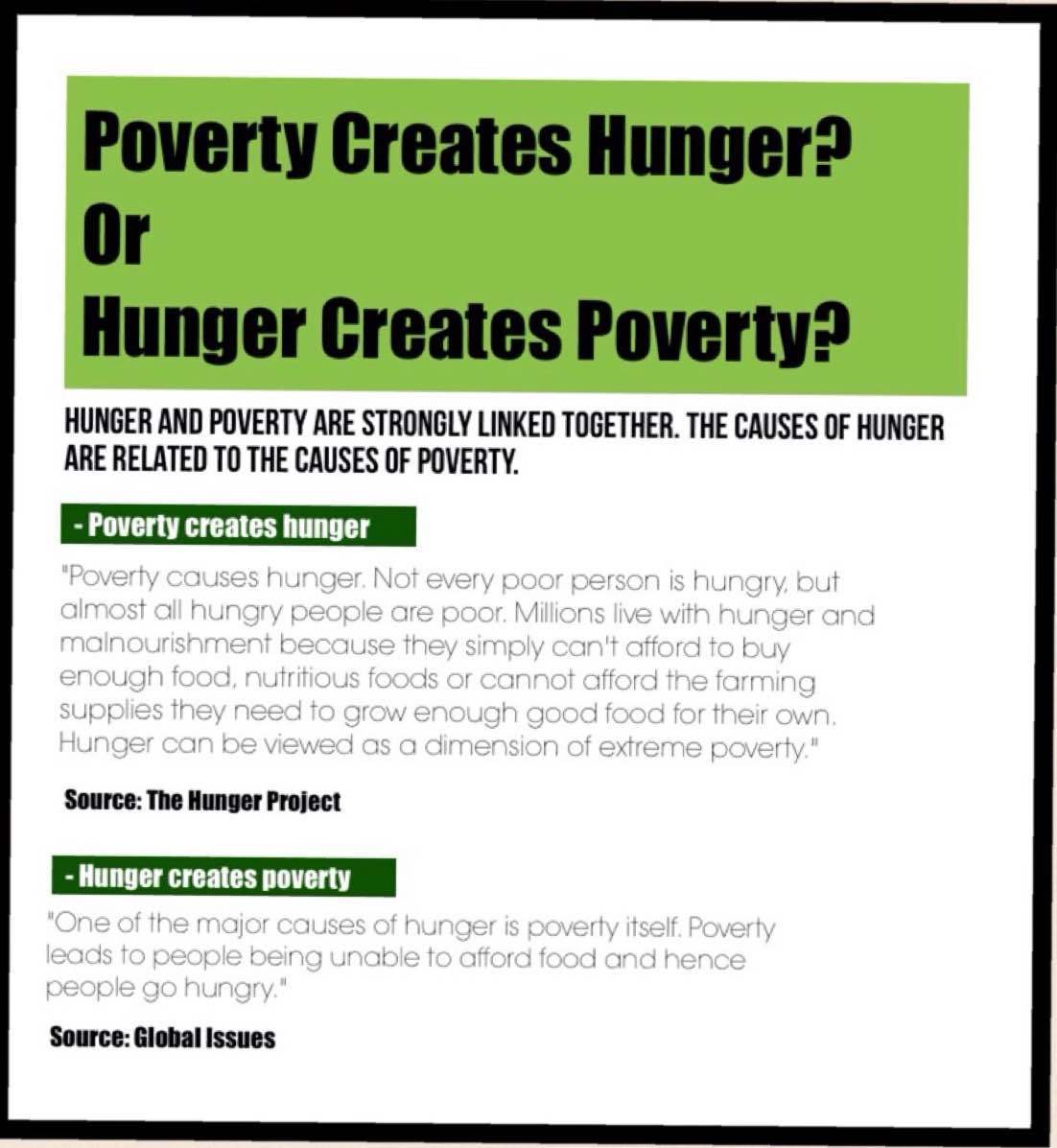 1. Why we still have hunger in the world (causes of hunger): Natural disasters, climate/weather, fluctuating market prices, conflicts, poverty, and poor agricultural systems. Inequality of wealth around the world is very high, too. It costs on average 25 cents a day to feed a hungry child. However, some people don't have enough money to spend 25 cents a day but some people have more than enough.