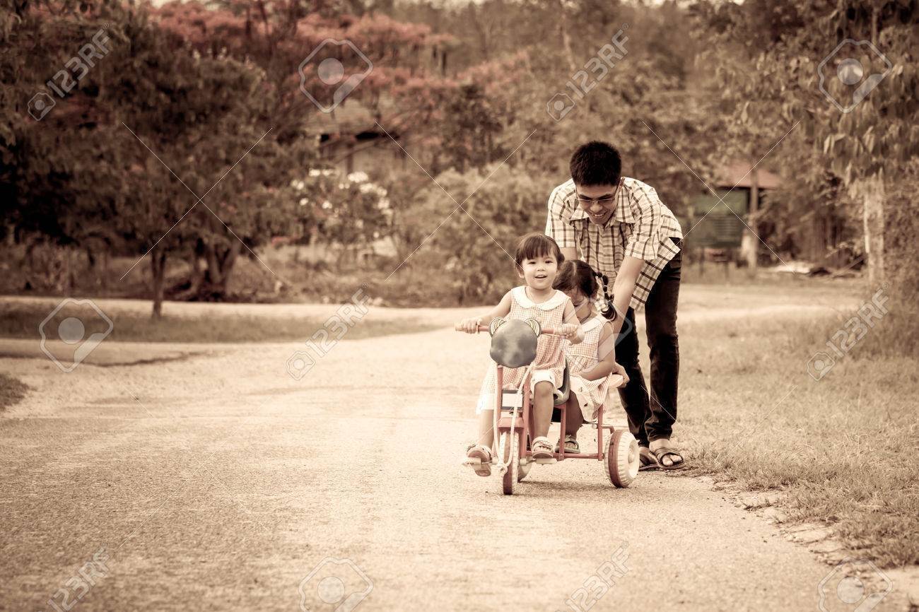 58402301 Niña Del Niño Que Se Divierte A Montar En Triciclo Con La Familia El Padre Está Empujando Triciclo F (image/jpeg)