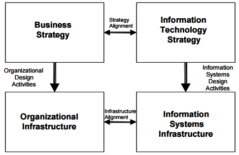 essential alignments between business and information technology strategies and between organizational and information systems infrastructures