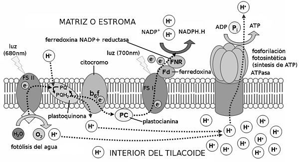 molécula de agua se divide en 2H+ + 2e- + 1/2O2). Los protones de la fotólisis se acumulan en