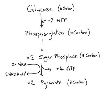 reduced NAD. While two TP molecules are converted into two molecules of pyruvate (3-C).