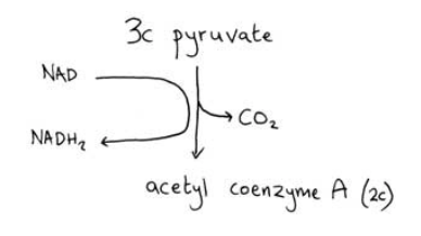 Pyruvate (3-C) decarboxylated with loss of Co2 and dehydrogenated with