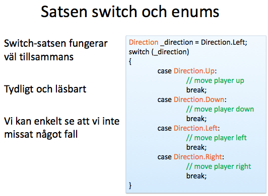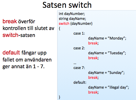 Använder sig av case-satser och är fördelaktigt när det finns många olika utfall