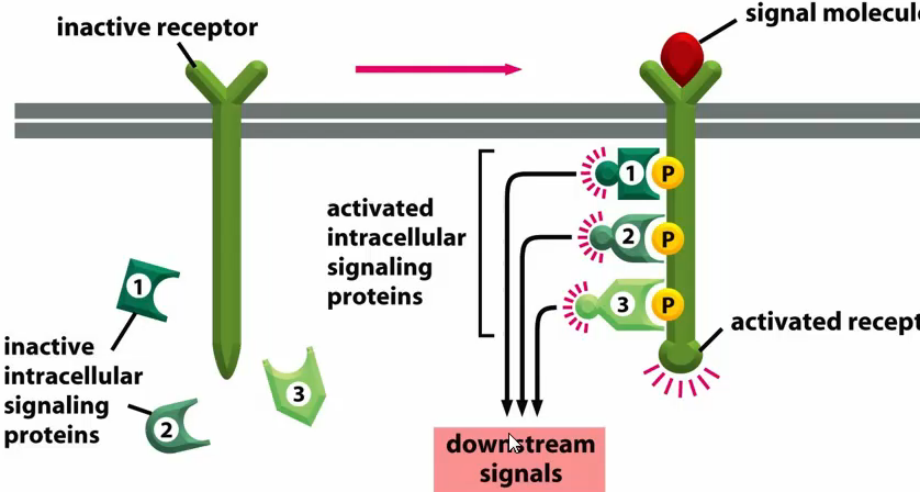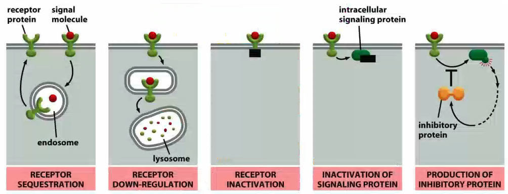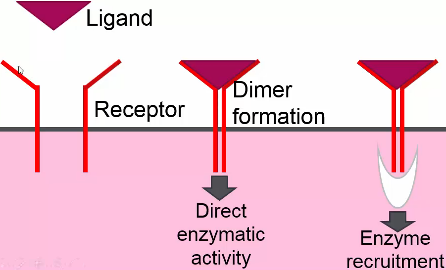 Engulfed, ligand leaves receptor, ligand broken down, receptor recycled