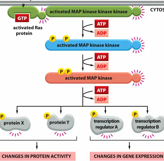 Phoshorylates -OH on serine, threonine and tyrsoine in proteins