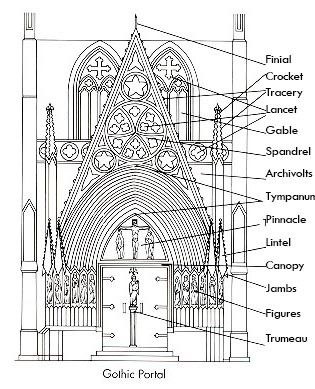 gable*. These portals are decorated with a multitude of characters and surrounded by the jambs* featuring large