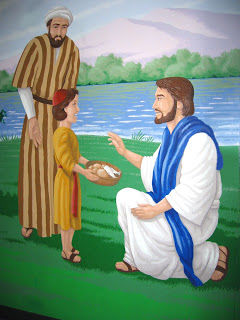 presented his two fishes to Jesus. Jesus took them, blessed them, and when