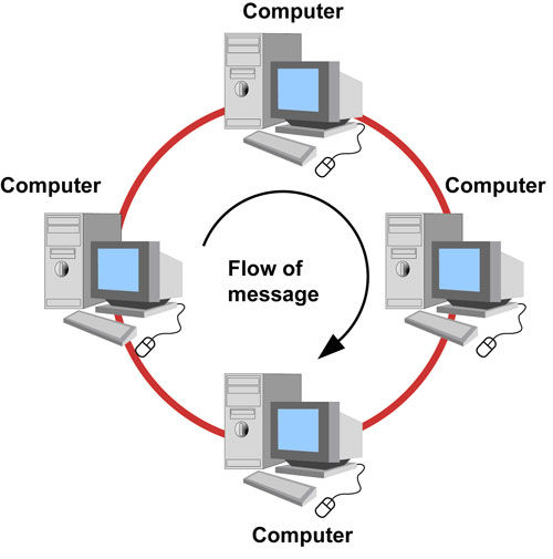 In a ring network each computer is connected to the ones either side of it. Data is sent in one direction around the ring until it finds the computer it was sent to.