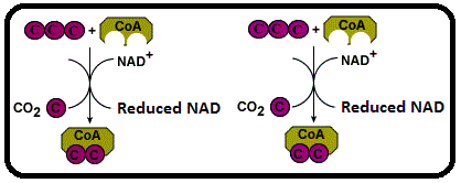 2 pyruvate + 2 NAD+ (oxidised) + 2 CoA ------> 2 CO2 + 2 reduced NAD + 2 acetyl