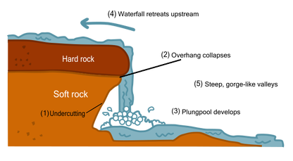 The resistant rock eventually collapses into the bottom of the waterfall.