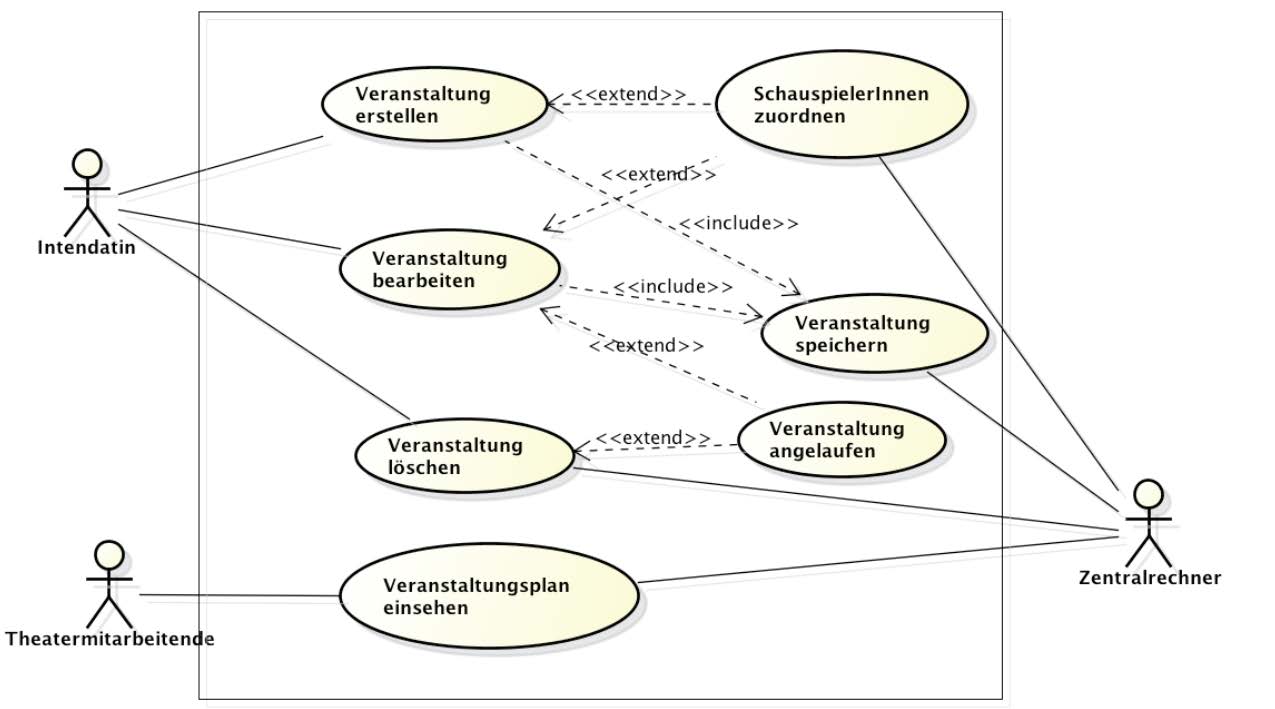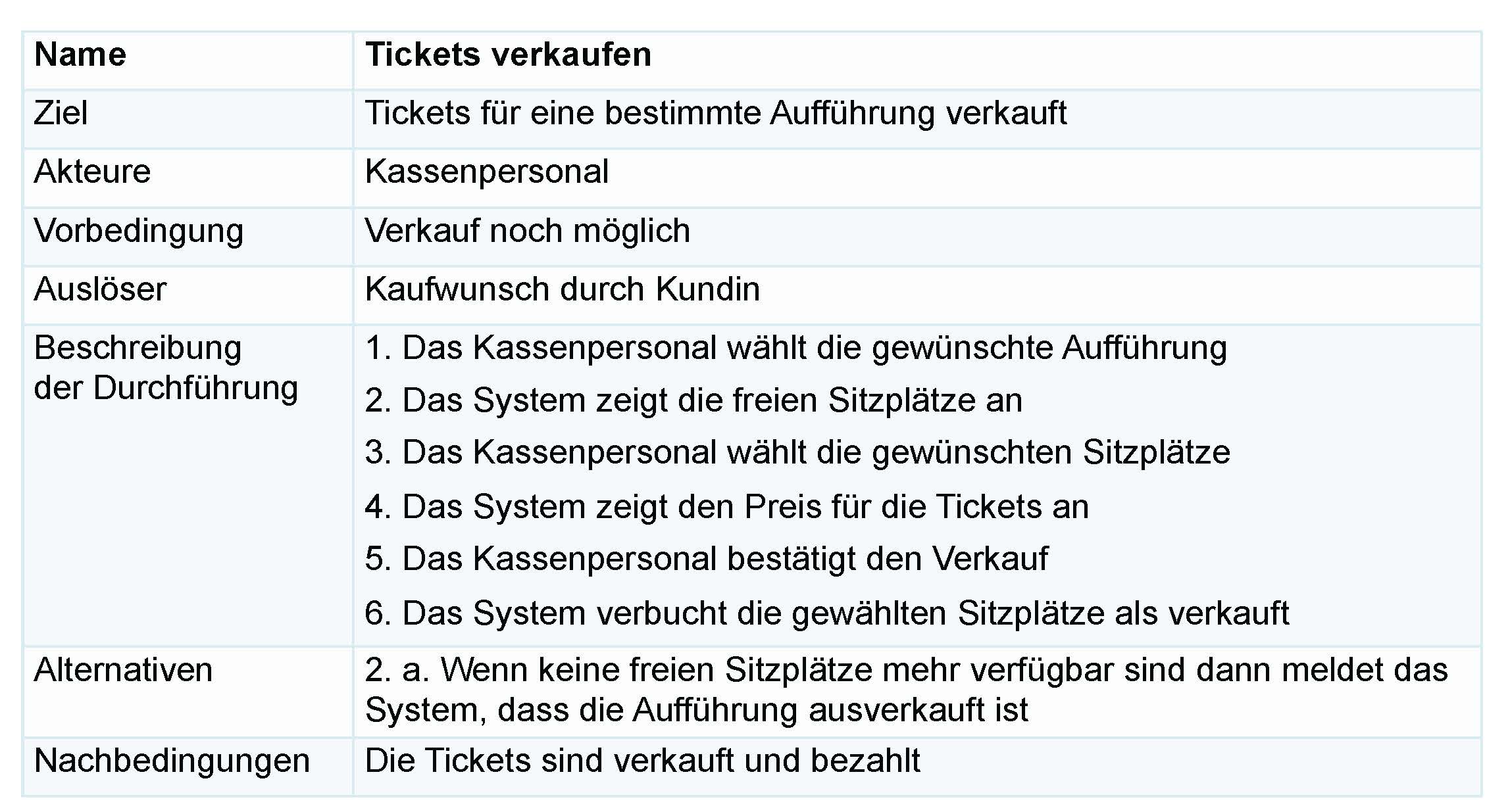 1. Name, 2. Ziel, 3. Akteure, 4. Vorbedingung, 5. Auslöser (Trigger), 6. Beschreibung der Durchführung (Aktivitäten), 7. Alternativen (Ausnahmefälle) 8. Nachbedingung (Resultate)