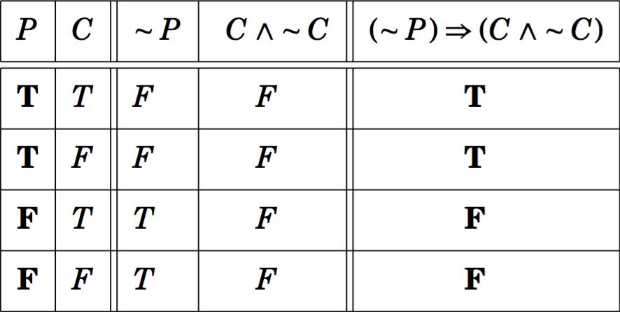 PROPOSITION : P is logically equivalent to (~P) → (C ^ ~C)