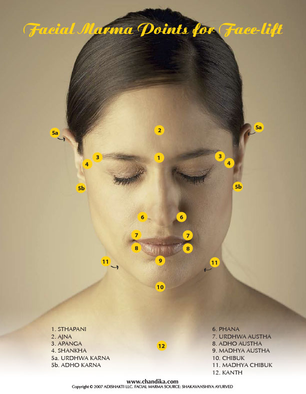 1. There are 107 marma points all over the body which represent where the vital energies flow where muscle, veins, arteries meet or bone and tendons sit