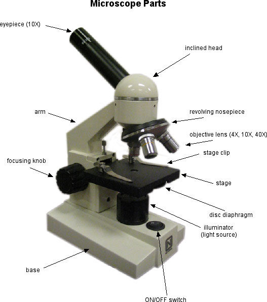 Objective lens- magnifies the specimen by different powers for eg x4, x10, x 40