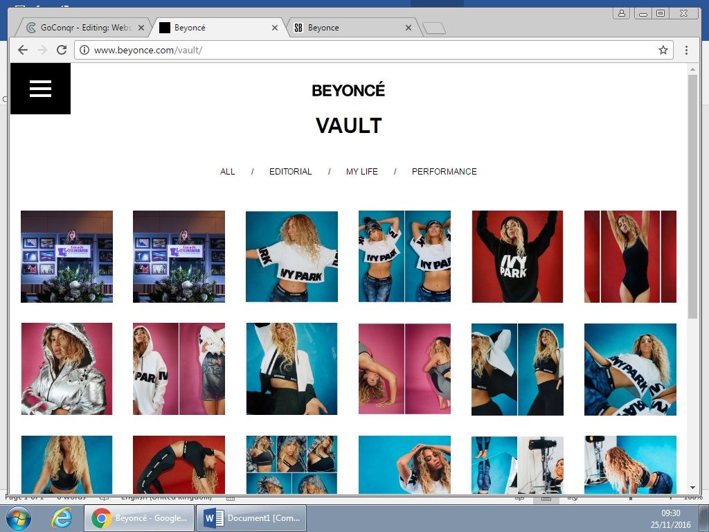 different parts of the site, such as: Music, Tours, Ivy Park, Vault and shop