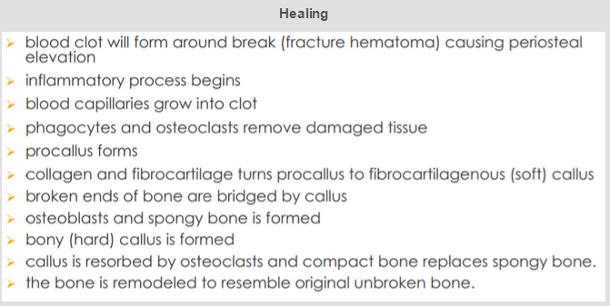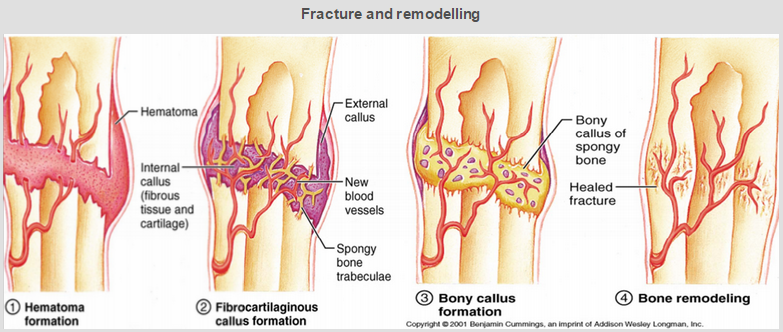 Fracture causes bleeding > elevates the periosteum. Periosteum is pushed out > procallus formation forms a bridge > callus is formed and reabsorbed