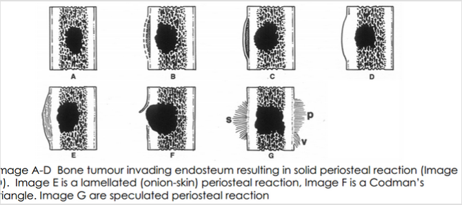E: "onion skin", solid periosteal reaction in layers, caused by aggressive tumour (malignant)