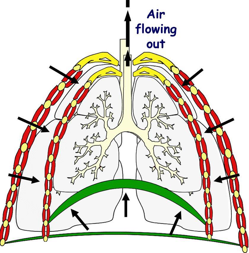 2) Diaphragm pushed upwards, RIbs/sternum move in and down
