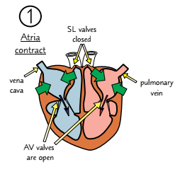 Aorta (than ventricle) close SL valves (stops back flow). Atria fill again
