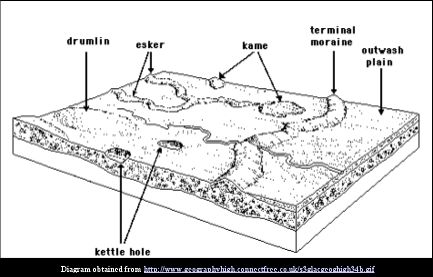 lake. When the ice finally melts, the kame terrace is abandoned as a ridge on the valley