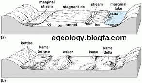 Kame Terrace: Most extensive type of kame. Results from the infilling or a marginal glacial