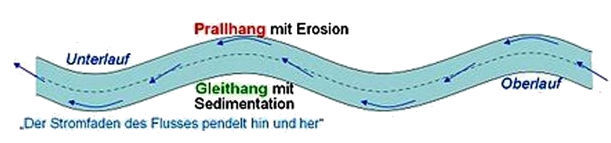 durch Pflanzen/Steine im Untergrund fließt das Wasser asymmetrisch zum Ufer