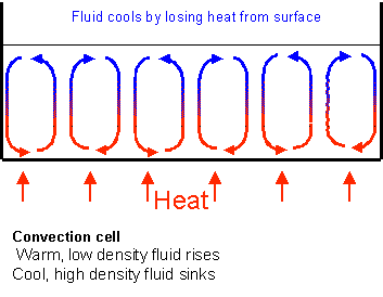 LESS DENSE HOT PARTICLES RISE UP FORCING COLD ONES DOWN, THEN COOL AT THE TOP FLOATING DOWN AGAIN