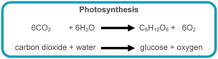 Symbol Equation= 6CO2 + 6H20 --> C6H12O6 + 6O2