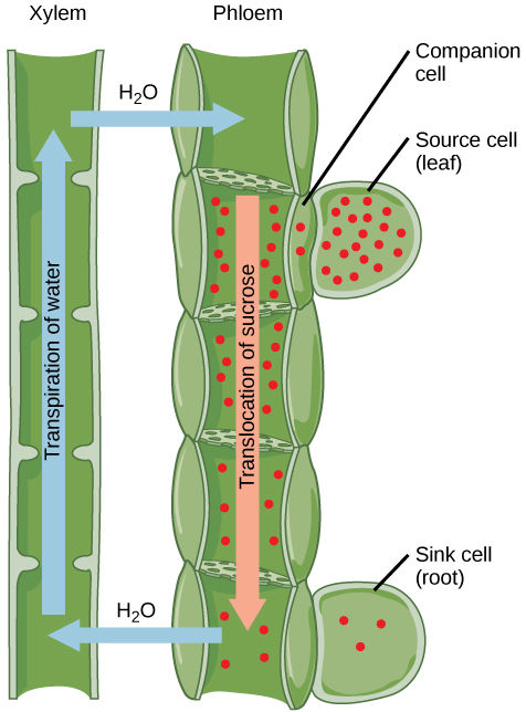 Phloem tubes transport sugars like sucrose and