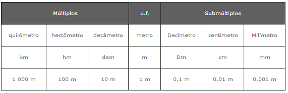 Unidades de Comprimento A unidade de principal de comprimento é o metro, entretanto existem situações em que essa unidade deixa de ser prática. Se queremos medir grandes extensões ela é muito pequena, por outro lado se queremos medir extensões muito "pequenas", a unidade metro é muito "grande".Os múltiplos e submúltiplos do metro são chamados de unidades secundárias de comprimento.Na tabela abaixo vemos as unidades de comprimento, seus símbolos e o valor correspondente em metro. Na tabela, cada unidade de comprimento corresponde a 10 vezes a unidade da comprimento imediatamente inferior (à direita). Em conseqüência, cada unidade de comprimento corresponde a 1 décimo da unidade imediatamente superior (à esquerda).QuilômetrokmHectômetrohmDecâmetrodamMetromDecímetrodmCentímetrocmMilímetromm1000 m100 m10 m1 m0,1 m0,01 m0,001 mRegras Práticas:Para passar de uma unidade para outra imediatamente inferior devemos fazer uma multiplicação por 10. Ex : 1 m = 10 dmPara passar de uma unidade para outra imediatamente superior, devemos fazer uma divisão por 10. Ex : 1 m = 0,1 damPara passar de uma unidade para outra qualquer, basta aplicar sucessivas vezes uma das regras anteriores. Ex : 1 m = 100 cm 1 m = 0,001 km Uidades de Área Quilômetro quadradokm2Hectômetro quadradohm2Decâmetro quadradodam2Metro quadradom2Decímetro quadradodm2Centímetro quadradocm2Milímetro quadrado mm21x106 m21x104 m21x102 m21 m21x10-2 m21x10-4 m21x10-6 m2Regras Práticas:Para passar de uma unidade para outra imediatamente inferior devemos fazer uma multiplicação por 100. Ex : 1 m2 = 100 dm2Para passar de uma unidade para outra imediatamente superior, devmos fazer uma divisão por 100. Ex : 1 m2 = 0,01 dam2Para passar de uma unidade para outra qualquer, basta aplicar sucessivas vezes uma das regras anteriores. Uidades de Volume Quilômetrocúbicokm3Hectômetro cúbicohm3Decâmetro cúbicodam3Metro cúbicom3Decímetro cúbicodm3Centímetro cúbicocm3Milímetro cúbicomm31x109 m31x106 m31x103 m31 m31x10-3 m31x10-6 m31x10-9 m3Regras Práticas:Para passar de uma unidade para outra imediatamente inferior devemos fazer uma multiplicação por 1000. Ex : 1 m3 = 1000 dm3Para passar de uma unidade para outra imediatamente superior, devemos fazer uma divisão por 1000. Ex : 1 m3 = 0,001 dam3Para passar de uma unidade para outra qualquer, basta aplicar sucessivas vezes uma das regras anteriores. LitroO litro( l ) é uma medida de volume muito comum e que corresponde a 1 dm3. 1 litro = 0,001 m3 => 1 m3 = 1000 litros1 litro = 1 dm31 litro = 1.000 cm31 litro = 1.000.000 mm3 Sistema Internacional de Unidades O Sistema Internacional de Unidades é baseado em 6 unidades fundamentais. A unidade fundamental de comprimento é o metro. Para cada unidade existem as unidades secundárias, que são expressas através da adição de um prefixo ao nome correspondente à unidade principal, de acordo com a proporção da medida.