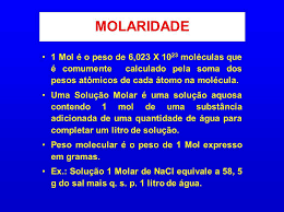Sabendo quantas gramas há em 1 mol por litro, calcular quantas gramas há em 1 milimol.Como foi calculado a massa de Na+ por litro, calcular a massa para decilitro. Como já havia sido calculado a massa de Na+ para um milimol, calcular para 145 milimol. Tendo os dados da massa do Na+ em 145 milimols para um decilitro, calcular para 1 litro. Sabendo o valor de Na+ para um litro de sangue, calcular para 7 litros de sangue. 6) Conforme a revista saúde onde há o relato sobre pesquisas da Universidade do Estado da Pensilvânia, nos Estados Unidos de que o leite faz bem ao coração. Conforme estudos da Faculdade de Saúde Pública da Universidade de São Paulo o consumo de leite promove a diminuição da hipertensão... Sabendo que aproximadamente 250 gramas de leite contém 300 mg de Cálcio. Pesquisas também revelaram que para beneficiar uma pessoa, esta deve ingerir diariamente a quantidade 4 vezes desse volume de leite. Conhecendo a quantidade de leite ingerido, calcule o número de mol do cálcio ingerido que coincide com a molaridade do cálcio presente no leite. Dados: A densidade média do leite integral é praticamente a da água 1,032 mg/mL (desprezar). Ca = 40 u = 40 gComo deve ser ingerido de leite diariamente 4 vezes o volume de 250 mL que contém 300 mg de cálcio: Calculamos a molaridade pela regra de três:Posso também calcular a mesma molaridade pela expressão: 7) O vinagre é utilizado na alimentação, no tempero de saladas. O principal componente que confere a característica ao vinagre é o ácido acético (CH3COOH). Sabendo disso calcule a molaridade do ácido acético do vinagre cuja concentração é de 3%.Dados : C = 12; H = 1; O = 16.Conhecendo a massa do ácido acético e a porcentagem no vinagre, já dá para iniciar o cálculo. 3% = 3g de CH3COOH em 100 mL ou 100g de vinagre. Quanto terei em um litro de vinagre? Como a massa do CH3COOH é 60g, eu preciso de 60g de CH3COOH por litro para ter o vinagre 1 molar. A massa do ácido acético é de apenas 30g então:O ácido acético está presente no vinagre na concentração de 0,5 molar.