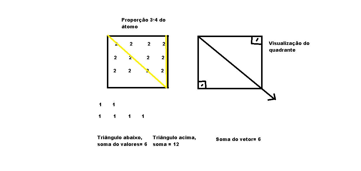 Após análise do quadrante em correspondência em estrutura proporcional de 3:4 do átomo, retomemos a verificação desta imagem ao lado.Observamos que 12 é a máxima presente no primeiro retângulo da proporção áurea. 12 raios atuantes na criação e transformação do átomo. Já que o triângulo é a menos porção da minha imagem, considera-se valor ideal de 12 raios. e 8 no vetor SPIN para acesso ao passado, presente e futuro. Criação, comunicação, transformação e transmutação energética.
