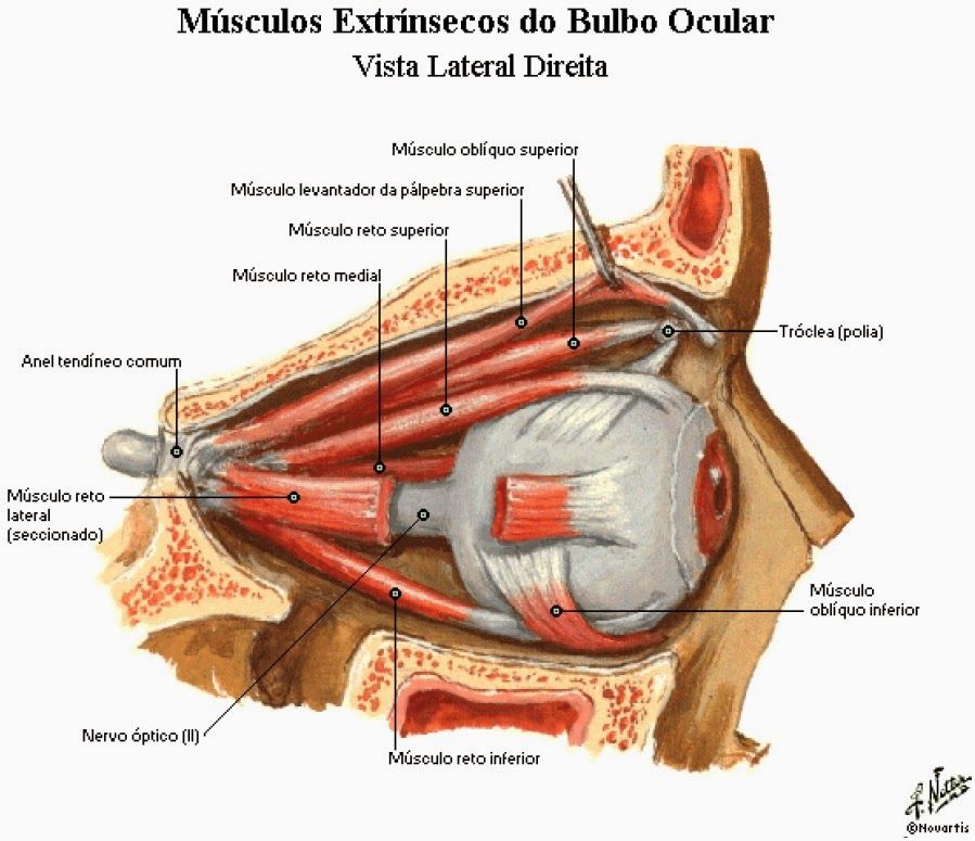 Os músculos extrínsecos do bulbo do olho são capazes de movimentar o olho em quase todas as direções : músculo reto inferior; músculo reto lateral; músculo reto medial; músculo reto superior; músculo oblíquo superior; músculo oblíquo inferior; Os músculos são inervados pelos nervos III,IV ou VI e , em geral , suas unidades motoras são pequenas permitindo ,assim, um movimento rápido,preciso e suave dos olhos .